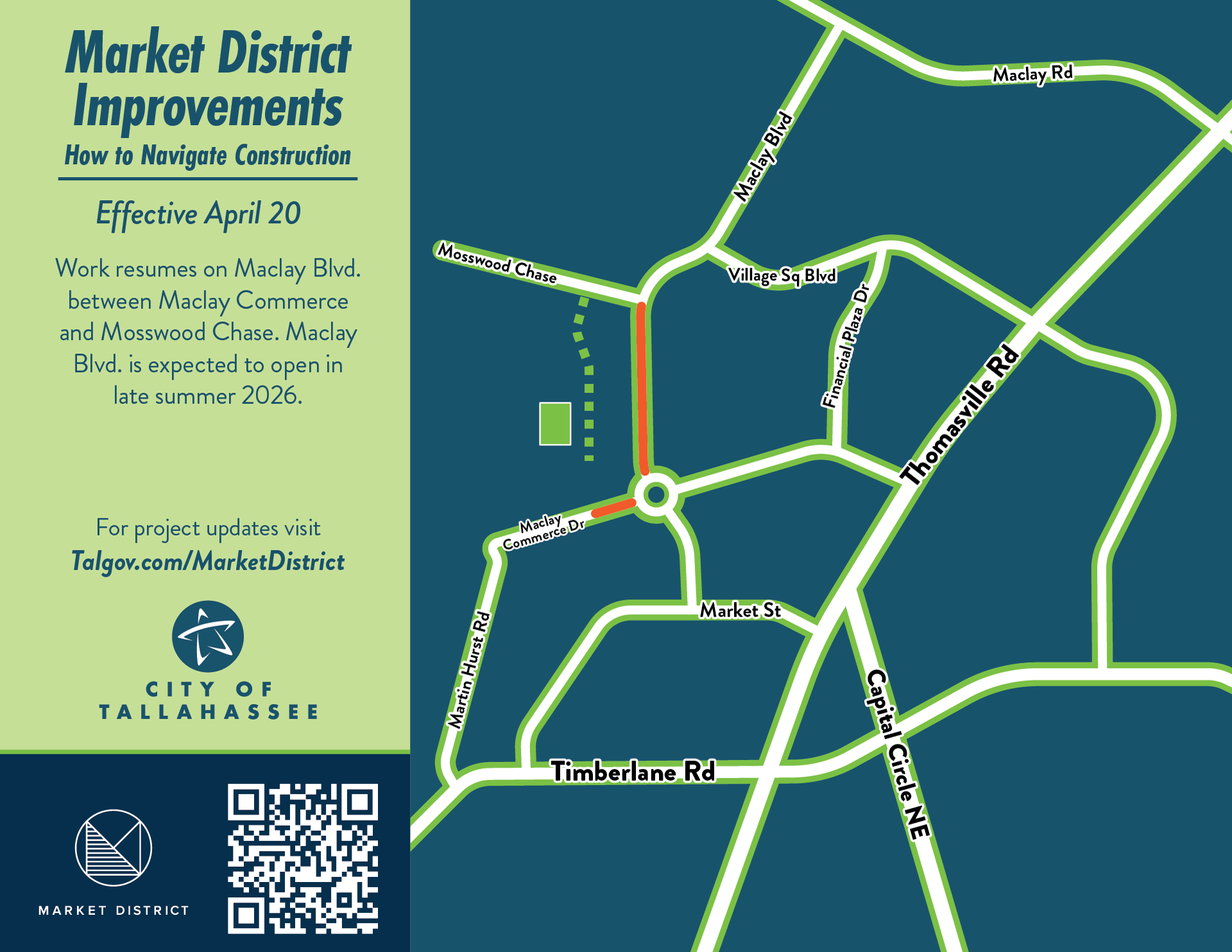 The City of Tallahassee completed the West Stormwater Facility in August 2023. This portion of the project included construction of a roughly 8‐acre wet detention pond that serves as a regional stormwater facility for a large part of the Market District. The facility provides water quality treatment and protection against flooding for the entire 300-acre watershed that drains to it, including the pending roadway improvements on Maclay Boulevard and Maclay Commerce Drive and the future park being implemented by Blueprint.